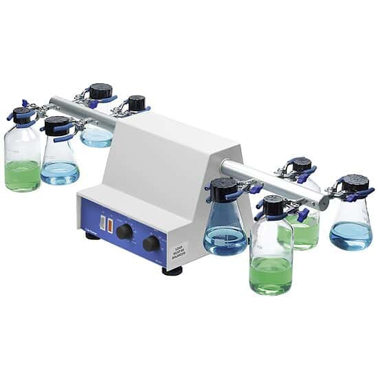 The variable-speed shaker features two side arms with adjustable clamps capable of holding eight flasks or bottles up to 500 mL capacity. Use for prolonged continuous shaking or set the built-in analog timer from 10 to 60 minutes and unit automatically turns off when done. Electronic feedback controller ensures a constant speed, irrespective of load.